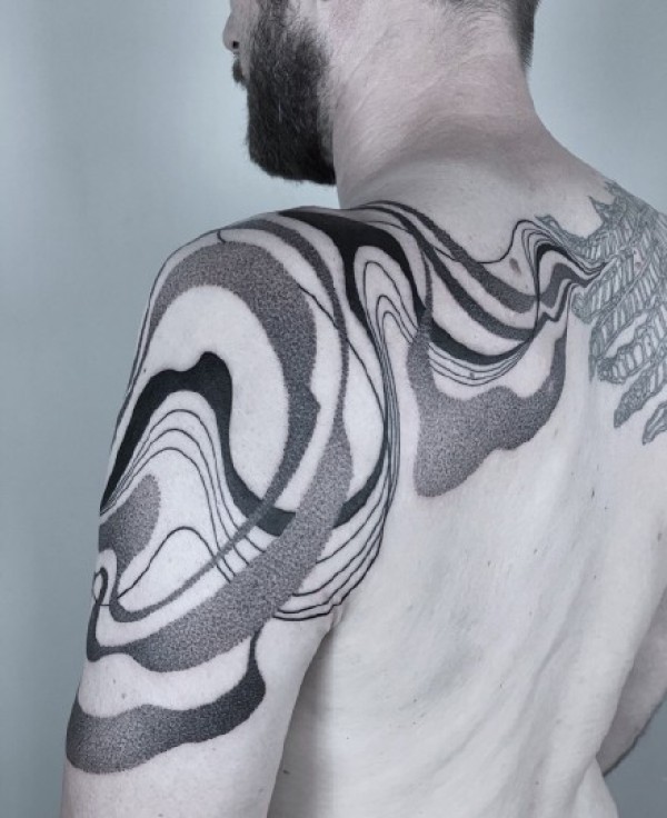 女生后腰纹身黑白灰风格抽象线条纹身图案