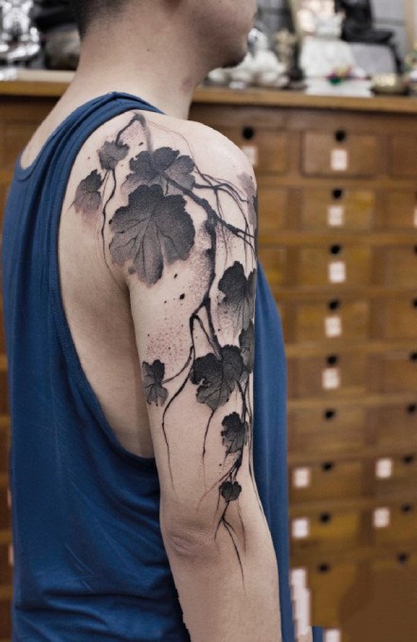 后肩唯美花藤英文图案图片_植物纹身图案大全_纹身图吧