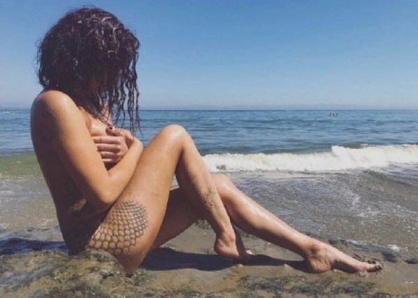 漂亮性感女孩身上美丽的美人鱼纹身图案鱼