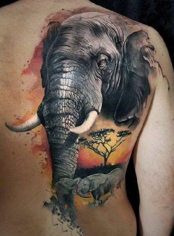 断了牙的满背写实风格大象纹身图案