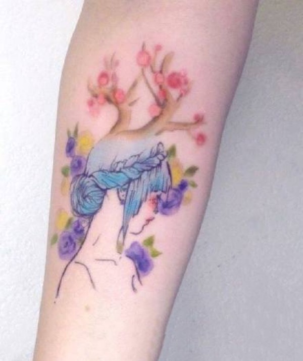 一组水彩色的潇洒女孩纹身作品