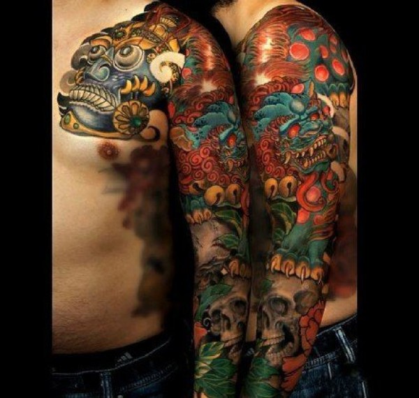 传统风格的一组男性花臂和花腿纹身图案欣赏