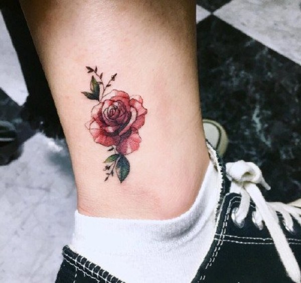 红色花朵:漂亮女孩的带刺红色玫瑰花纹身图案