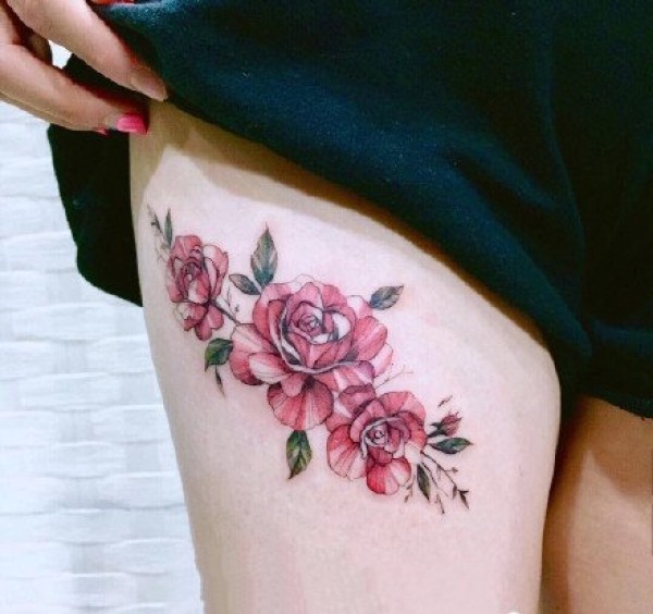 红色花朵:漂亮女孩的带刺红色玫瑰花纹身图案