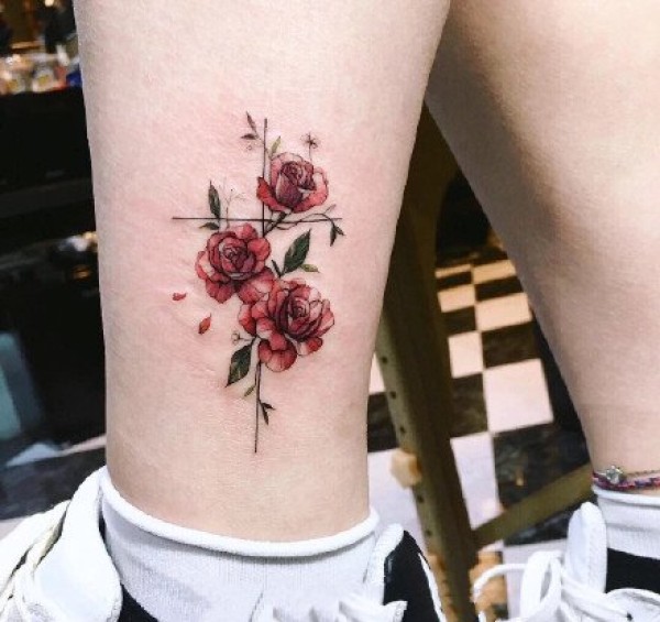 红色花朵:漂亮女孩的带刺红色玫瑰花纹身图案