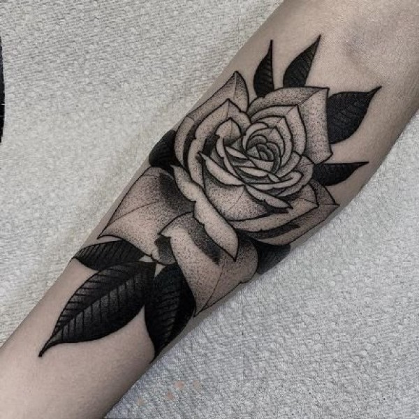 纹在手臂胳膊上的黑灰素花花卉纹身图案欣赏