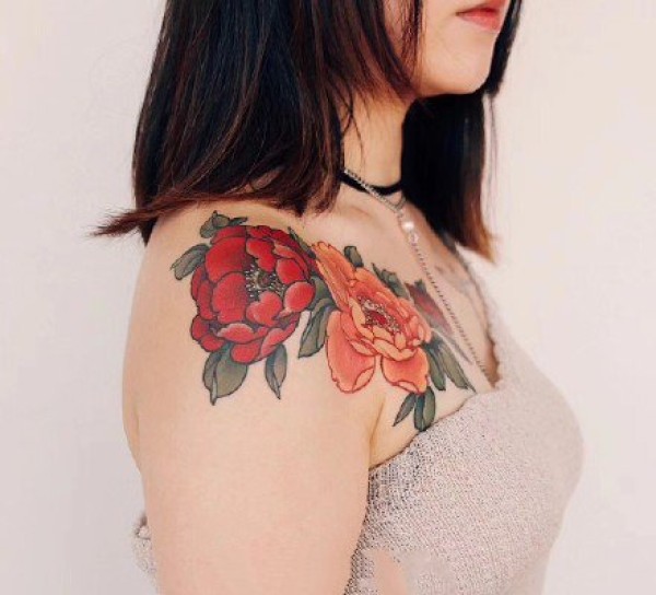 女性肩膀上多款漂亮的花朵纹身图案