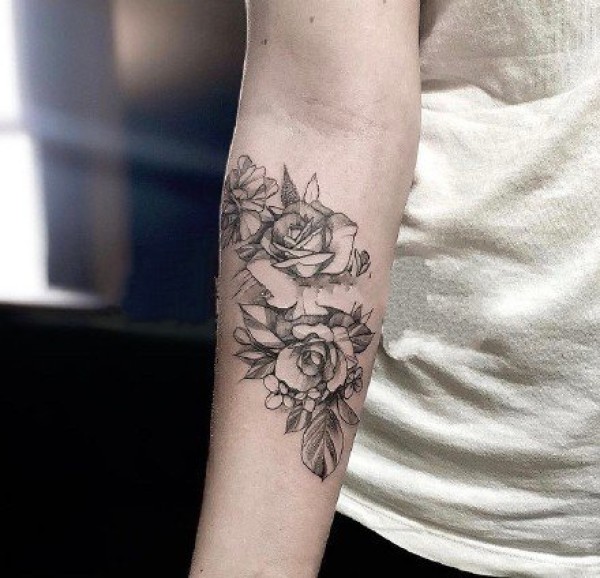 纹在手臂胳膊上的黑灰素花花卉纹身图案欣赏