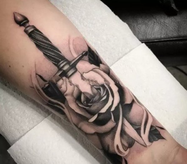 纹在手臂上的黑灰冷兵器匕首纹身图