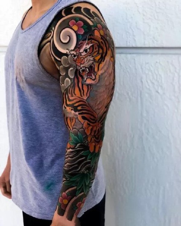 传统风格的一组男性花臂和花腿纹身图案欣赏