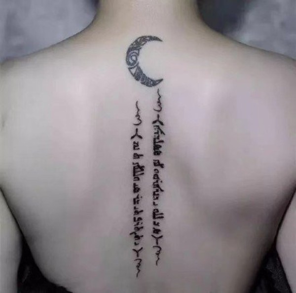 纹身后背女 女生脊柱上梵文和莲花纹身图片