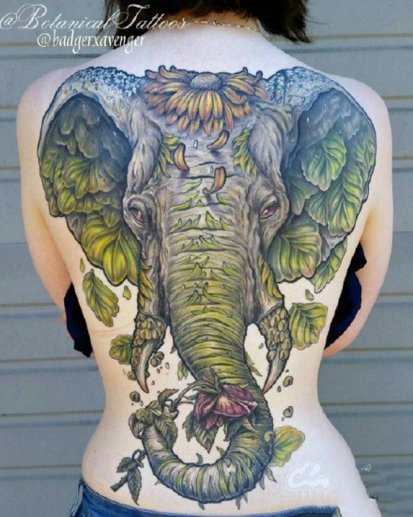 断了牙的满背写实风格大象纹身图案