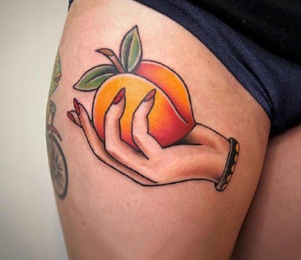 男生手臂上彩绘渐变简单线条植物叶子和桃子纹身图片