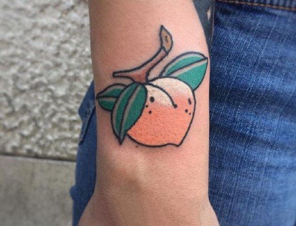 男生手臂上彩绘渐变简单线条植物叶子和桃子纹身图片