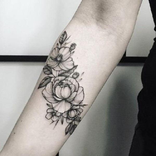 纹在手臂胳膊上的黑灰素花花卉纹身图案欣赏