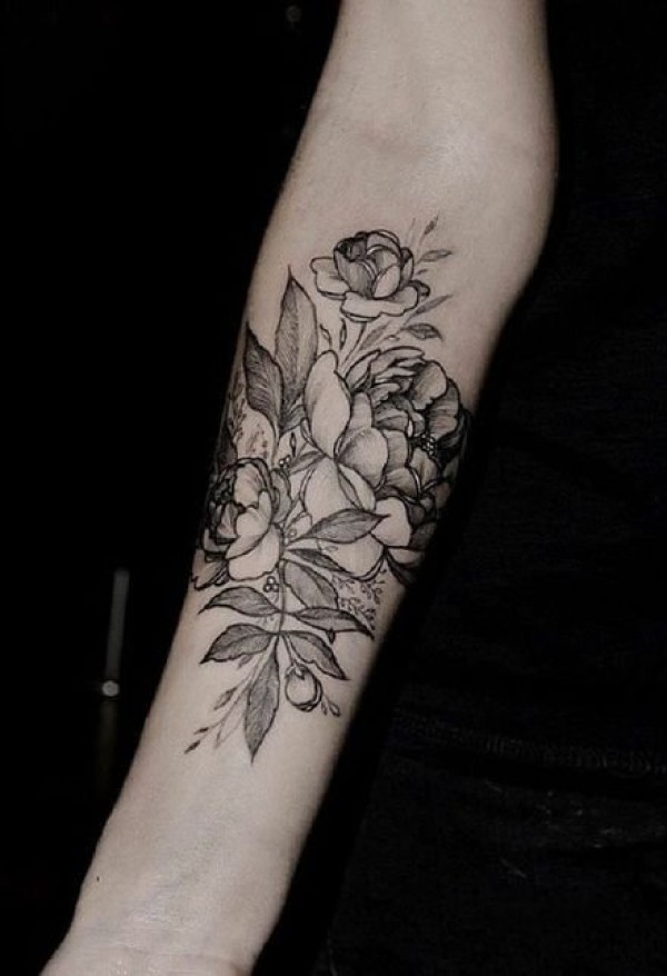 纹在手臂胳膊上的黑灰素花花卉纹身图案欣赏