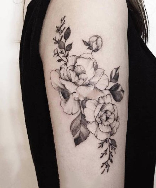 纹在手臂胳膊上的黑灰素花花卉纹身图案欣赏