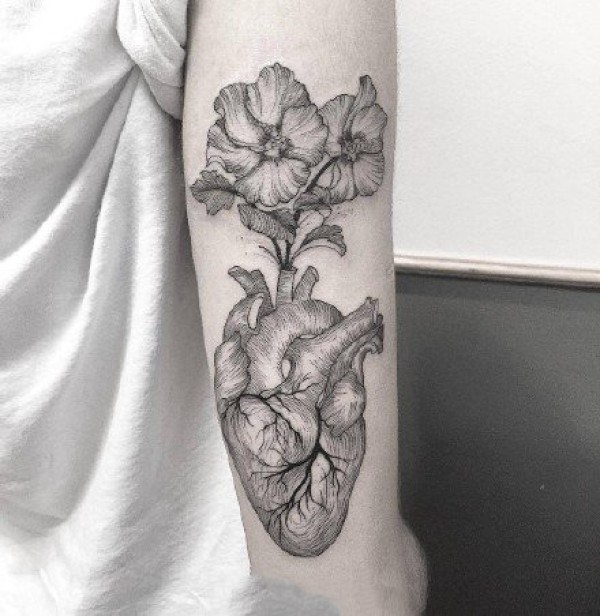 心脏纹身图案 女生手臂上黑灰纹身心脏纹身图案