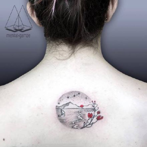 女生后腰纹身黑白灰风格抽象线条纹身图案