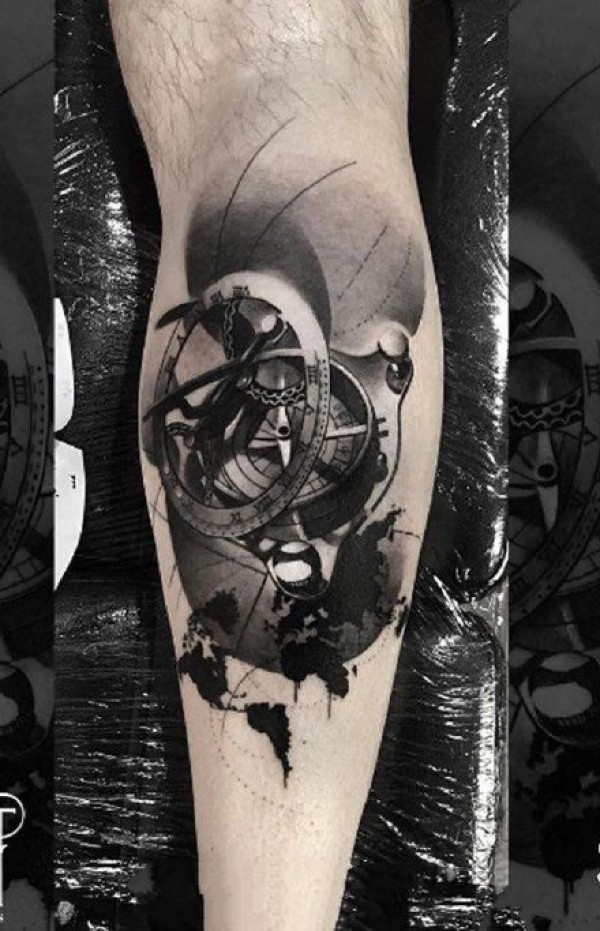 手臂上的大黑灰怀表人物肖像等花臂纹身图片