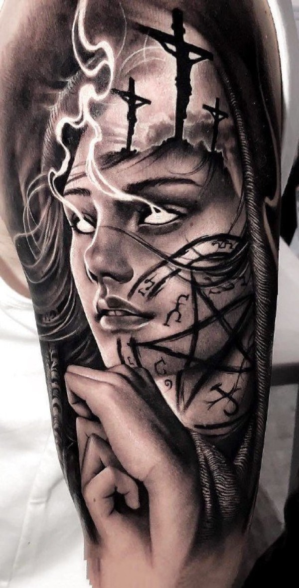 手臂上的大黑灰怀表人物肖像等花臂纹身图片