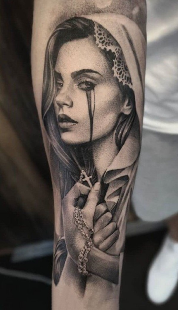 手臂上的大黑灰怀表人物肖像等花臂纹身图片