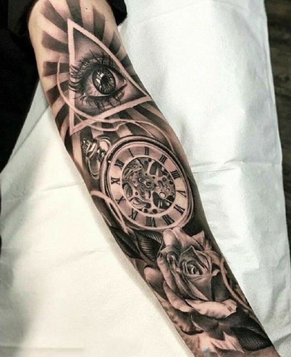 手臂上的大黑灰怀表人物肖像等花臂纹身图片
