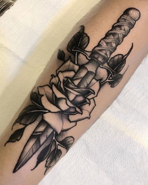 纹在手臂上的黑灰冷兵器匕首纹身图