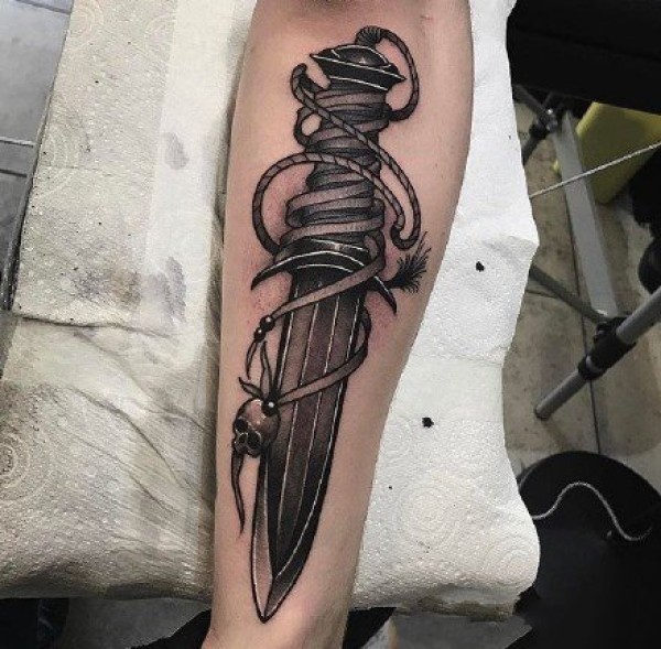 纹在手臂上的黑灰冷兵器匕首纹身图