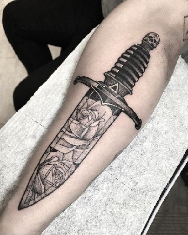 纹在手臂上的黑灰冷兵器匕首纹身图