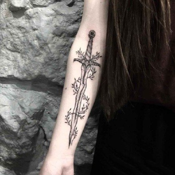纹在手臂上的黑灰冷兵器匕首纹身图