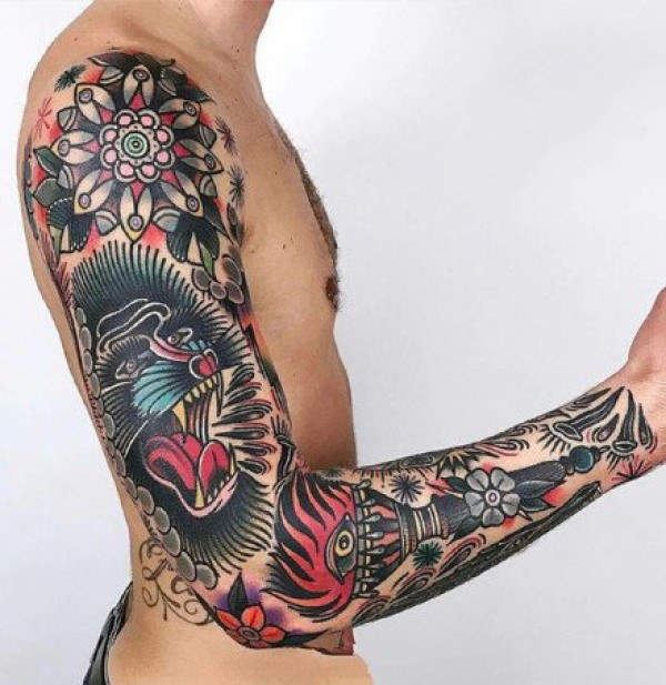 传统风格的一组男性花臂和花腿纹身图案欣赏