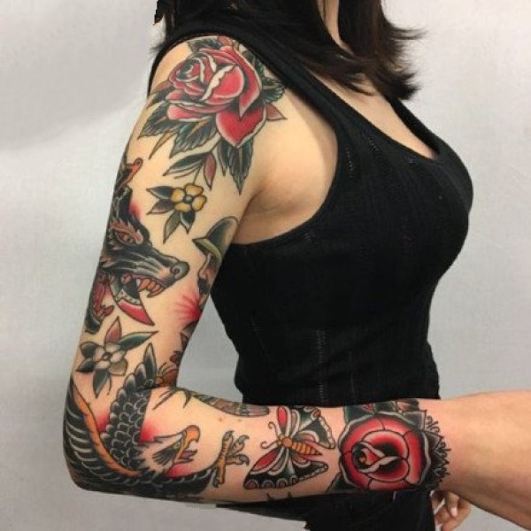 oldschool风格的拼接花臂纹身作品欣赏