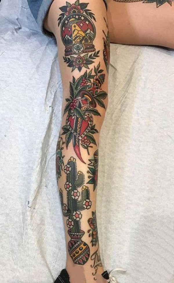 传统风格的一组男性花臂和花腿纹身图案欣赏