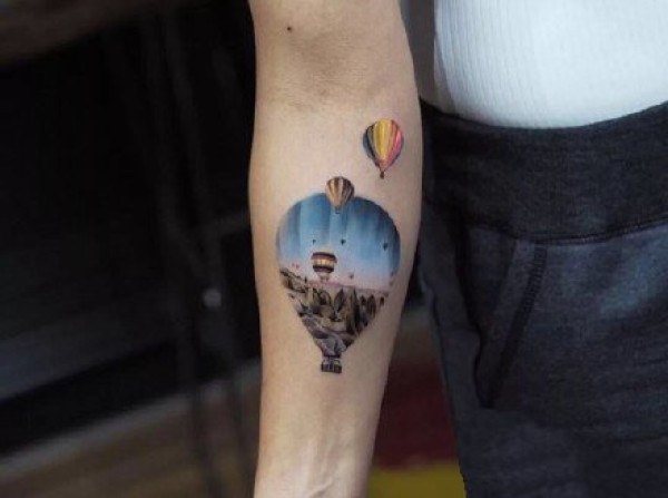 热气球纹身 男生手臂上花朵和热气球纹身图片