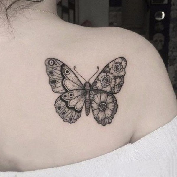 满背蝴蝶骷髅和花纹身图案
