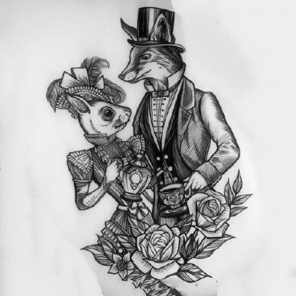 school狐狸玫瑰花纹身图案手稿