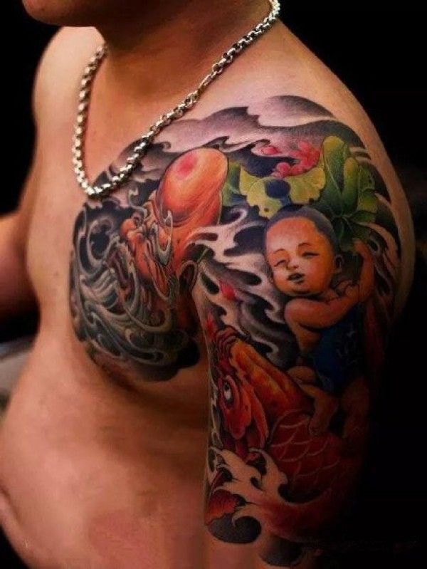 一幅潮流很酷的半甲佛头与象神纹身图片图片推_半甲纹身图案大全_纹身图吧