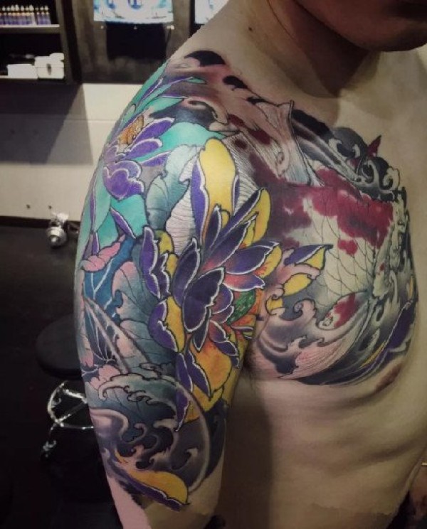 来自中国经典的传统半甲喜庆鲤鱼牡丹纹身手稿_半甲纹身图案大全_纹身图吧