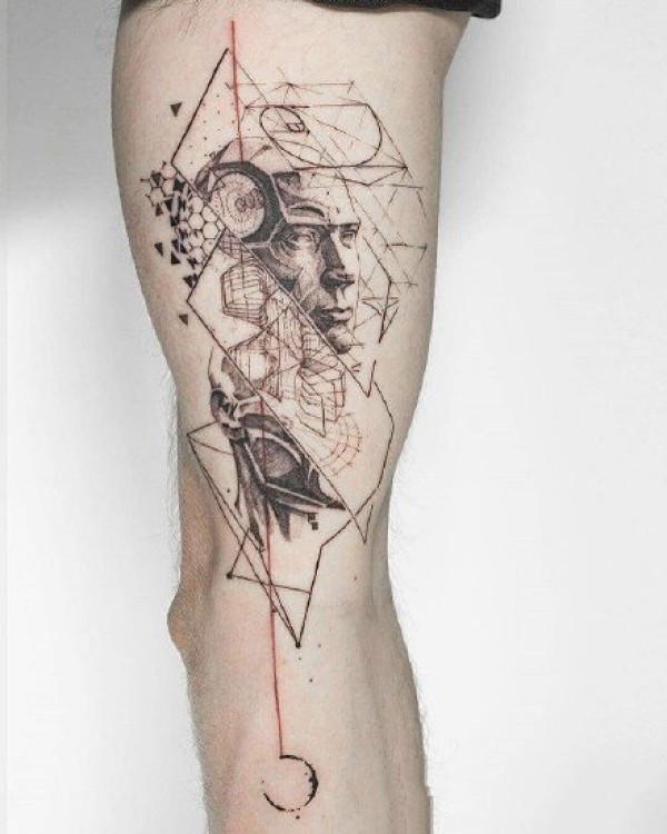 男生小腿上彩绘几何线条骷髅和人物肖像拼接纹身图片