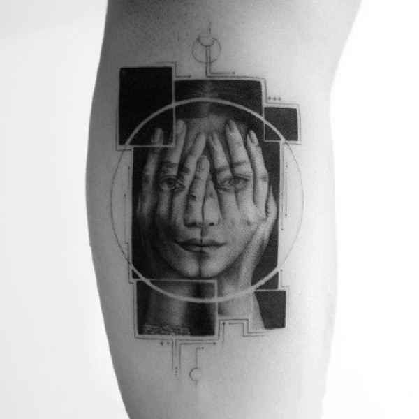 男生小腿上彩绘几何线条骷髅和人物肖像拼接纹身图片
