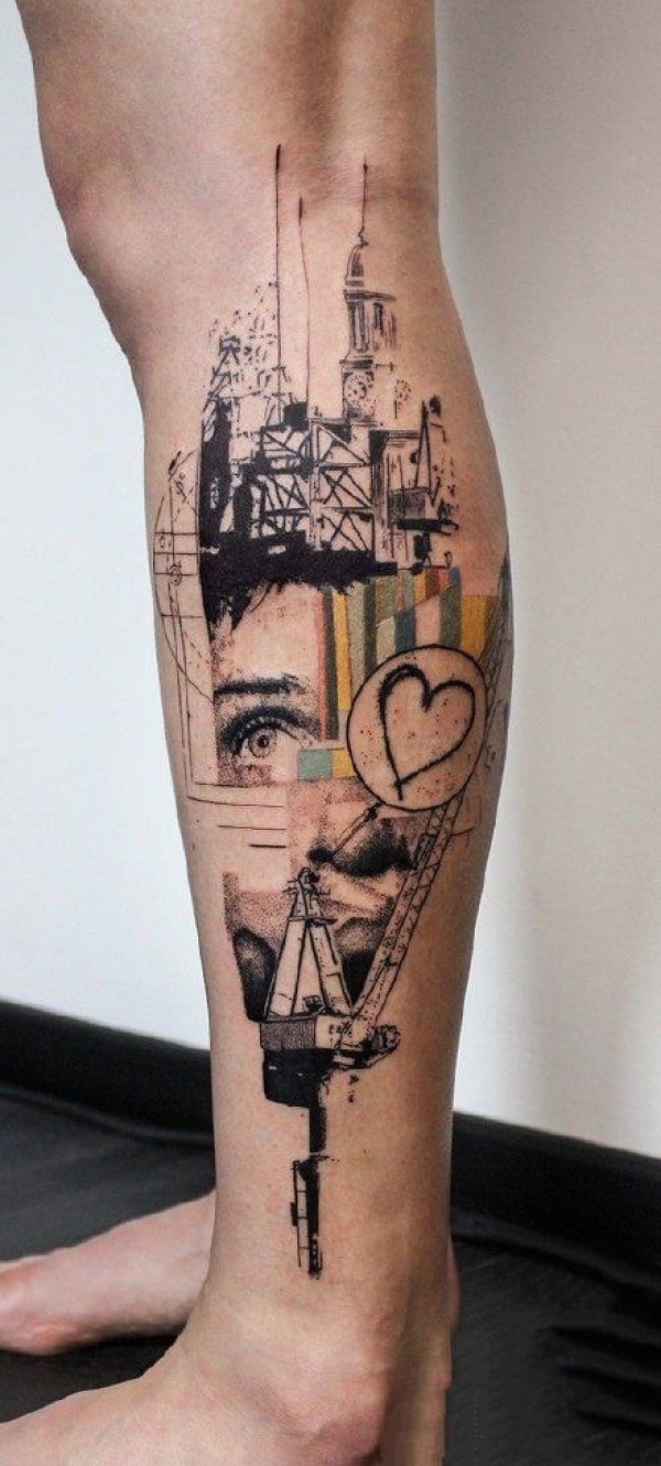 男生小腿上彩绘几何线条骷髅和人物肖像拼接纹身图片