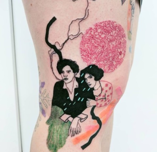 大腿上黑白灰风格点刺身抽象线条人物肖像纹身图片