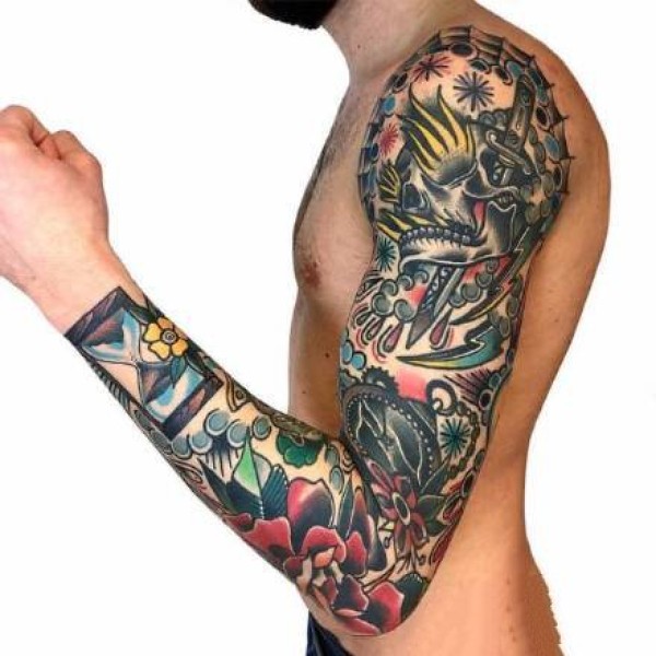 传统风格的一组男性花臂和花腿纹身图案欣赏