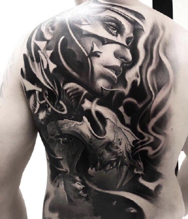 新传统风格的9张男性黑灰大满背纹身图案图片