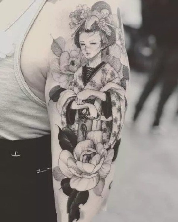 日本艺妓纹身图 黑灰或彩绘的日本艺妓包臂纹身图案