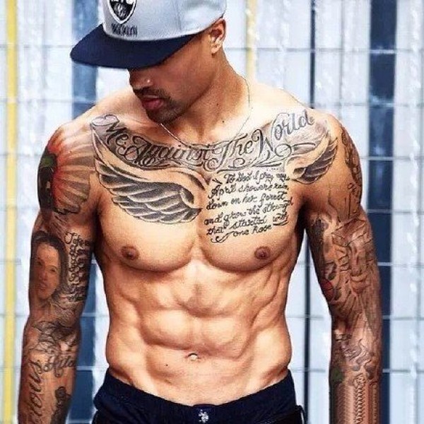 健身肌肉男胸前独特的英文纹身