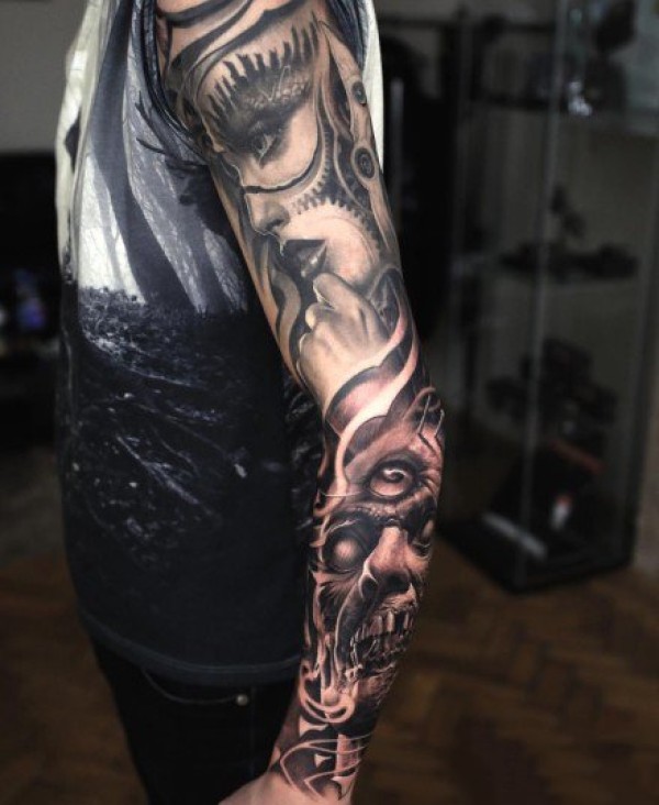 欧美花臂纹身_22张霸气黑灰欧美大黑花臂纹身图案作品图片