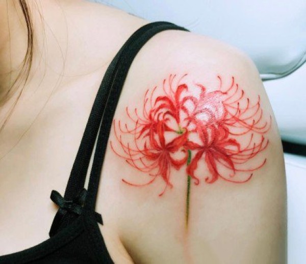 锁骨处美丽而骄傲的彼岸花纹身图案