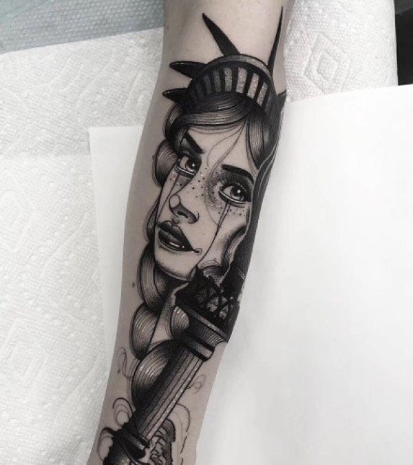 手臂上经典的点刺黑灰女郎纹身图案